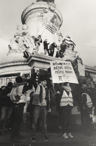 Ultimo riverbero di luce del tramonto. Ragazza con cartello ai piedi del Monument à la République assieme ai suoi compagni.